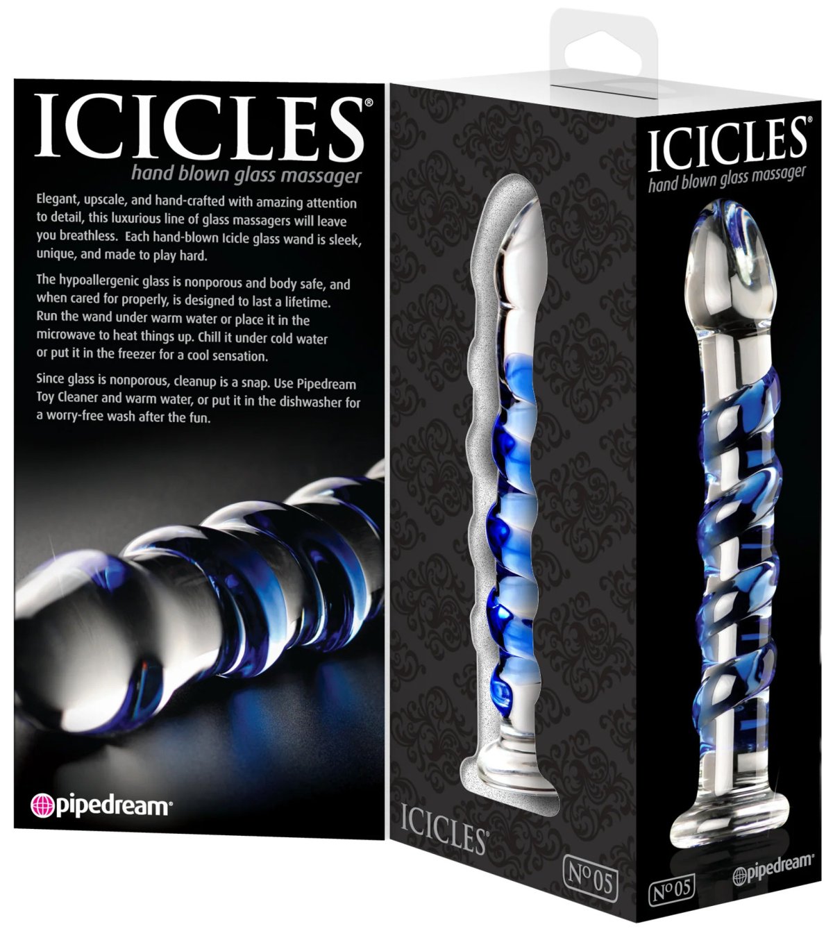 Je ručně vyráběné ze speciálního tvrzeného skla, které je neporézní a bezpečné pro lidské tělo. Hodí se pro hrátky s teplotou – stačí ho jen zchladit nebo naopak zahřát.