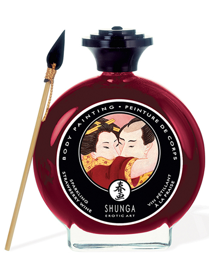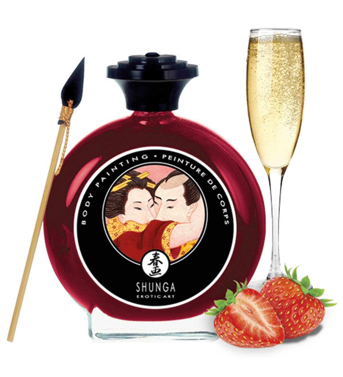 Bodypainting se sladkou chutí jahodového šampaňského má červenou barvu a je jedlý – až své sladké dílo dokončíte, můžete ho celé slízat.