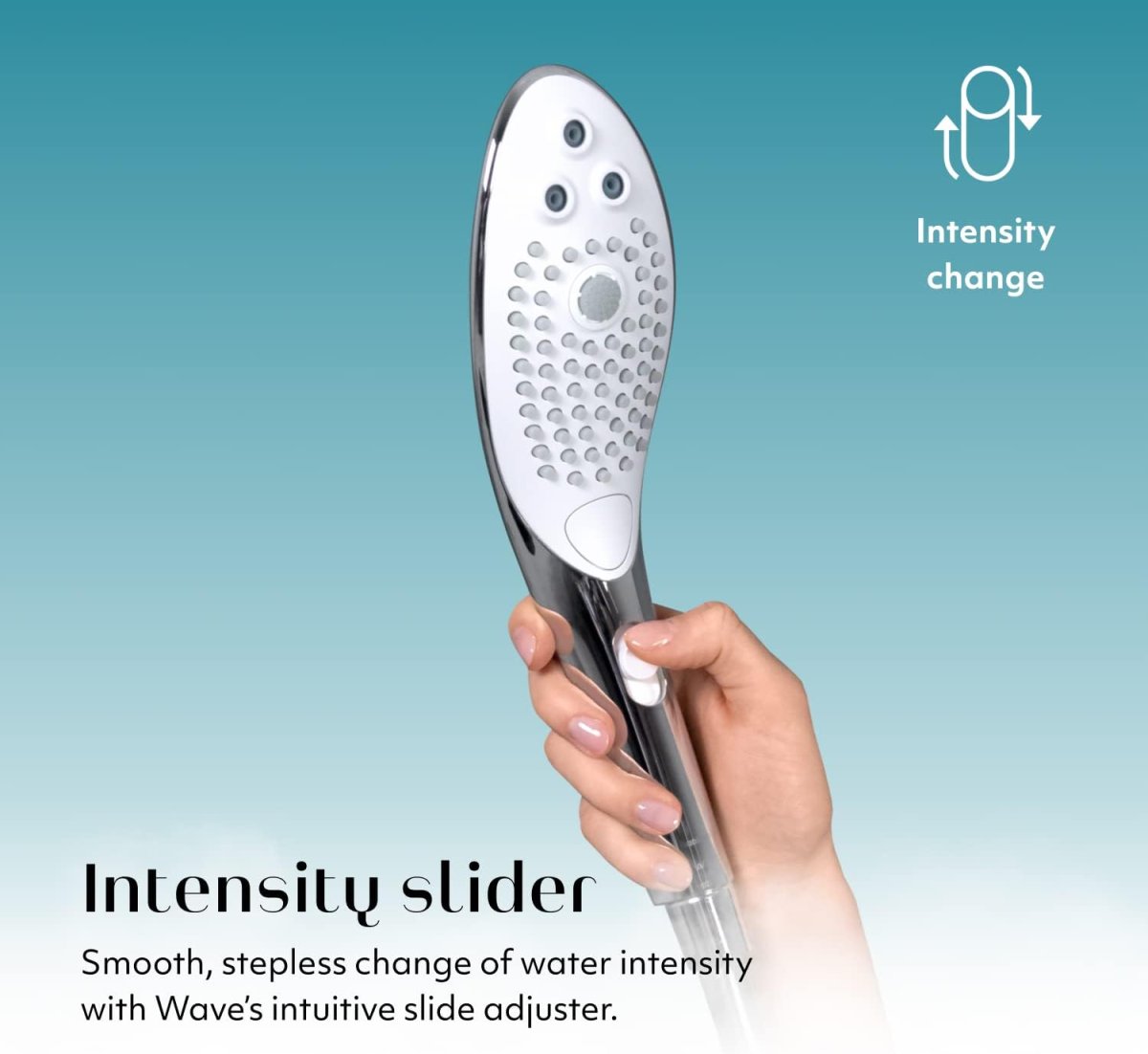 Womanizer Wave je první sprchová hlavice a vodní masážní stimulátor klitorisu v jednom. Snadno si nastavíte intenzitu tlaku a vyberete ze 3 nastavení trysek: