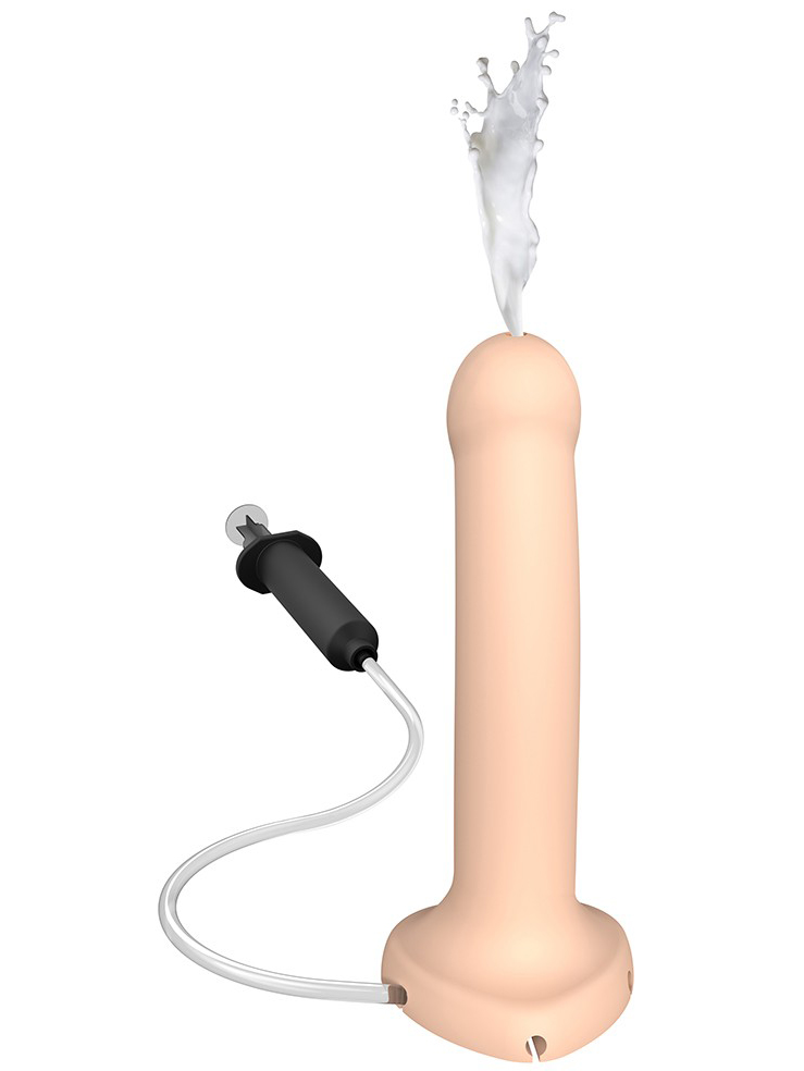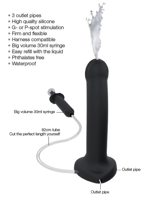 Středem dilda vede hadička, kterou bude proudit umělé sperma či jakákoliv jiná tekutina. Stačí naplnit stříkačku (objem 30 ml) a v pravý moment stlačit píst.
