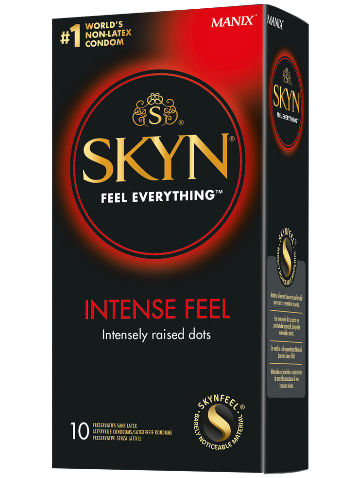 Kondomy SKYN Intense Feel jsou tenké, mají vroubky pro intenzivnější stimulaci a jsou vyrobené z měkkého polyisoprenu – neobsahují latex a nezpůsobují alergické reakce.