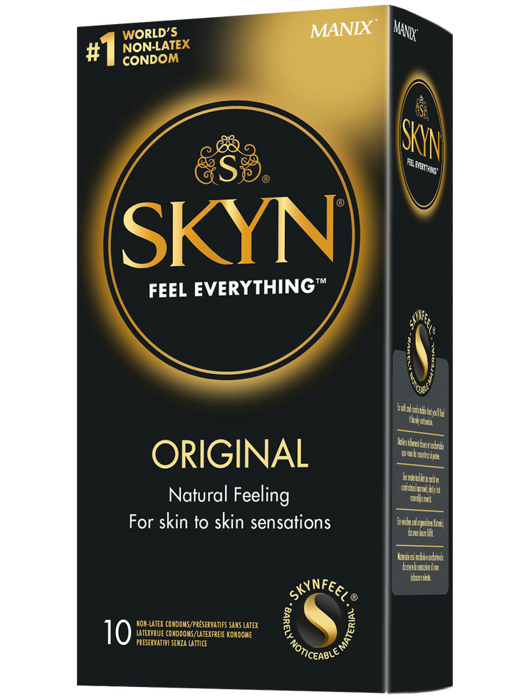 SKYN Original jsou parfémované a vyrobené z měkkého polyisoprenu – neobsahují latex, při sexu je téměř neucítíte a jsou vhodné i pro osoby s alergií na latex.
