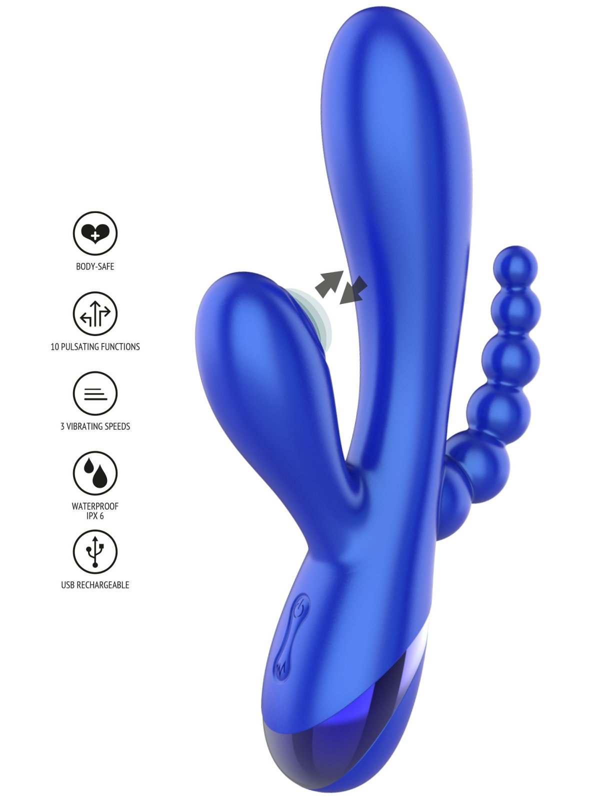 Vibrátor zajistí současnou stimulaci bodu G, klitorisu a zadečku. Má extra silné a hluboké vibrace a výstupek na klitoris intenzivně pulzuje.