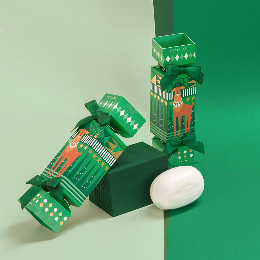 Mýdlo je zabaleno v papírové krabičce, která má vánoční potisk a připomíná bonbon. Neobsahuje parabeny, palmový tuk ani SLS.