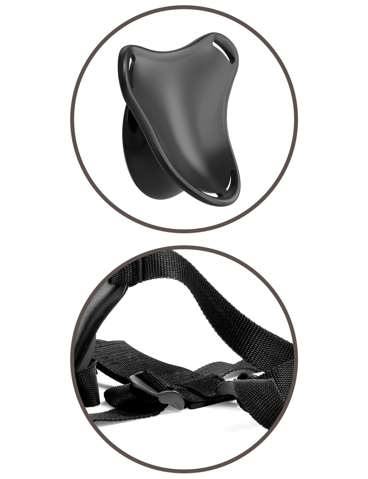 Postroj má netradiční systém uchycení hračky. Přední část tvoří plastová základna, ke které "přicucnete" dildo nebo vibrátor s přísavkou.