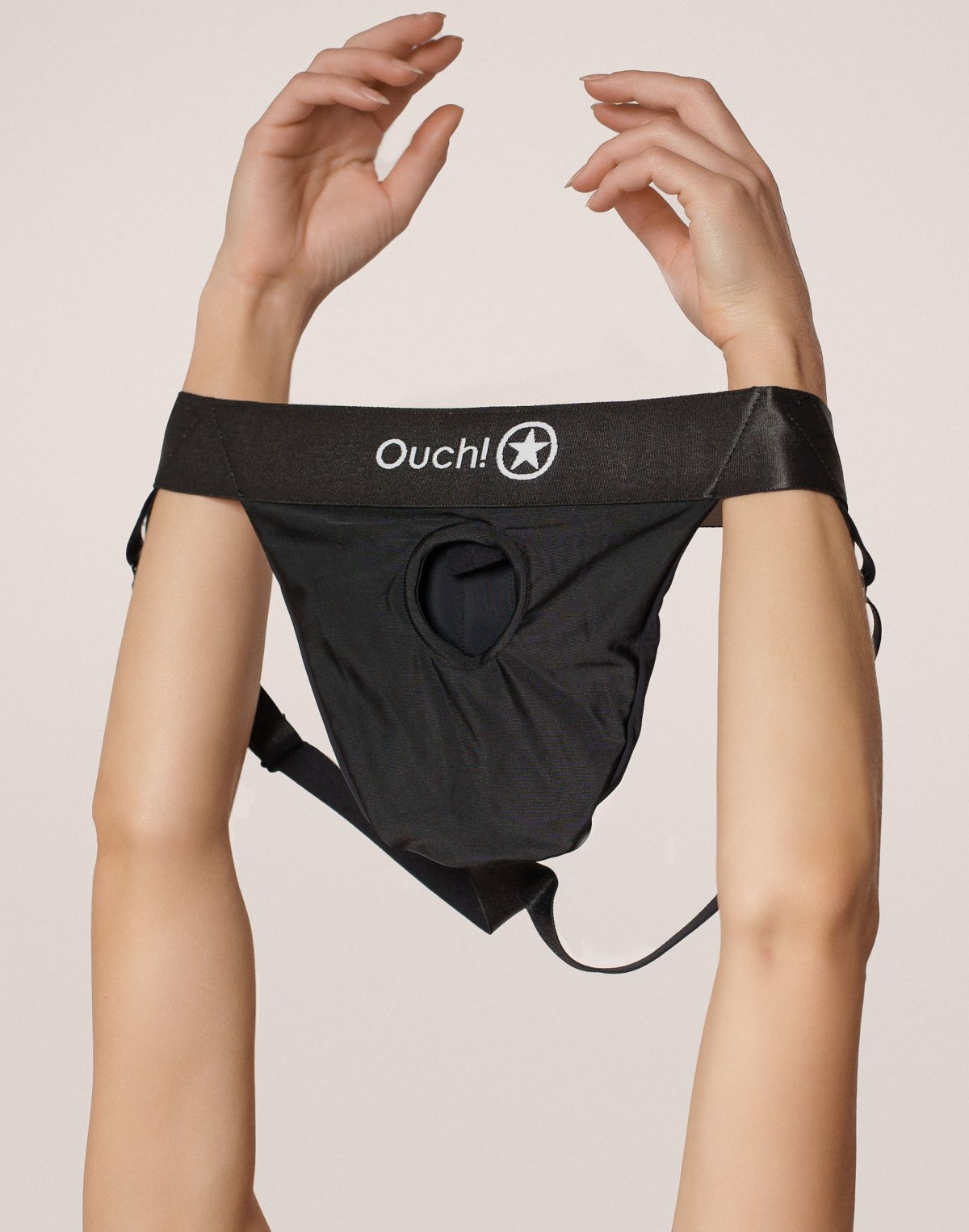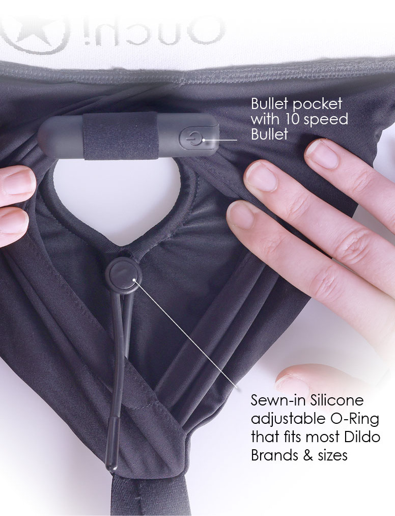 V lemu O-kroužku je zašitá silikonová smyčka s plastovým jezdcem – otvor můžete jednoduše zmenšit, díky čemuž do kalhotek upnete téměř jakékoliv didlo či vibrátor. Otvor je navíc krytý látkou, takže kalhotky neodhalují intimní partie.