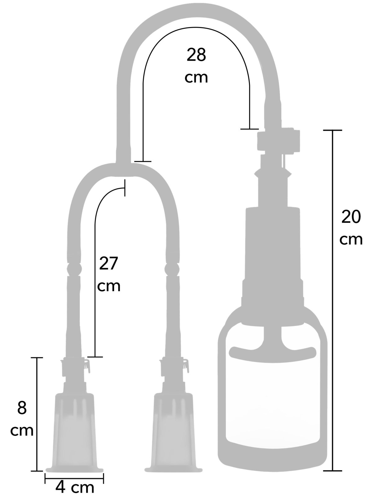 - Rozměry: celková délka 75 cm, délka pístu 20 cm, celková délka hadičky 55 cm, celková délka kalíšků 8 cm, vnější průměr kalíšků 4 cm