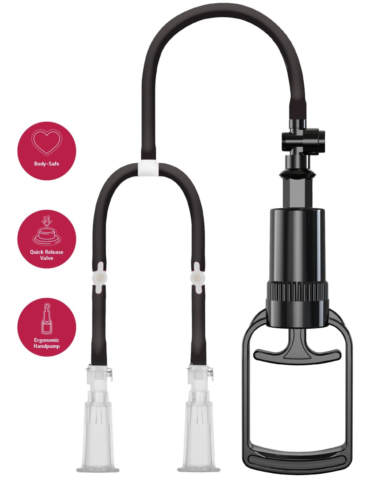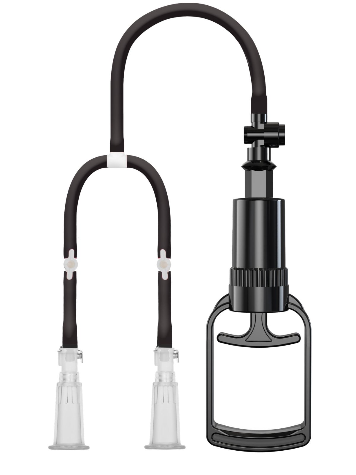 Každá z hadiček má šikovný zavírací ventil – můžete použít oba kalíšky najednou, nebo jen jeden z nich (lze využít třeba i pro prokrvení klitorisu). A až budou obě bradavky dostatečně prokrvené, podtlak snadno uvolníte zmáčknutím ventilku.