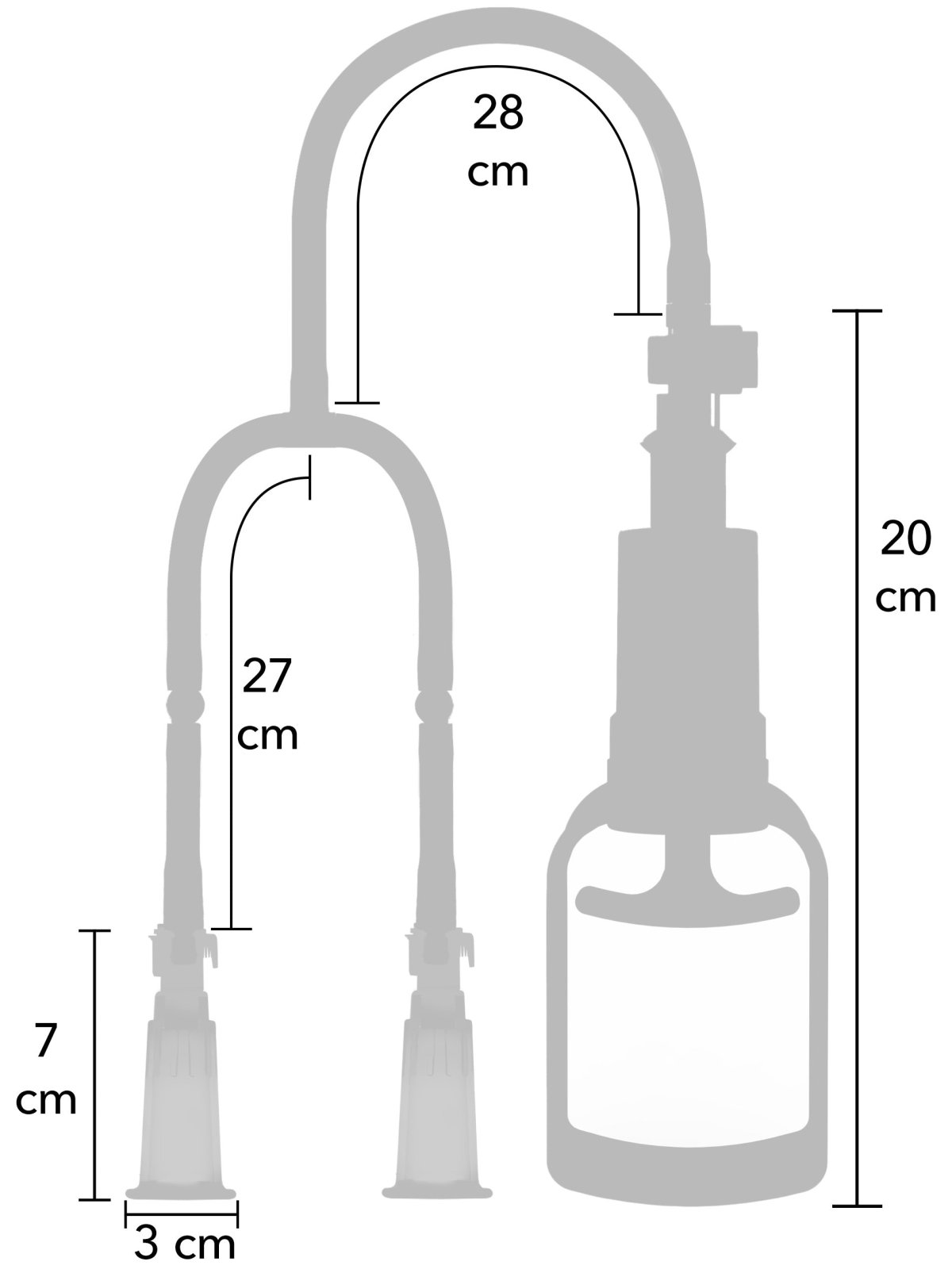 - Rozměry: celková délka 75 cm, délka pístu 20 cm, celková délka hadičky 55 cm, celková délka kalíšků 7 cm, vnější průměr kalíšků 3 cm