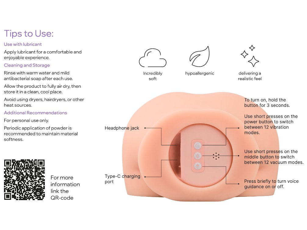 Masturbátor je tvarovaný jako dámský zadeček a má 1 otvor – realisticky vymodelovanou vaginu. Pro intenzivní zážitek vám nabídne sání, vibrace a sténání.