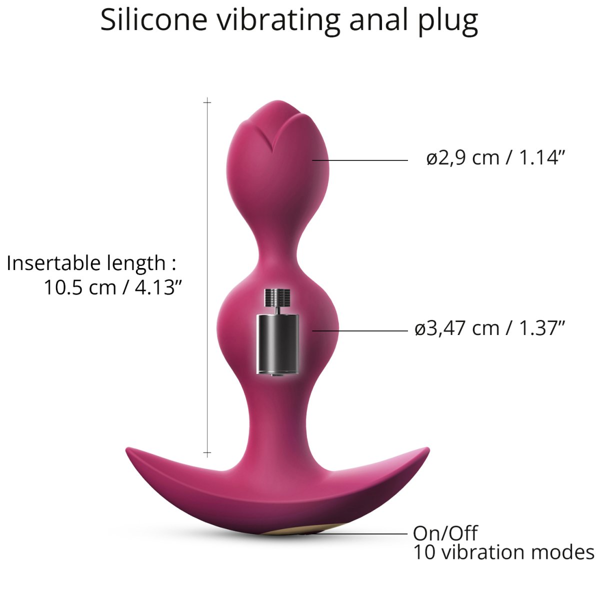 Kolík má extra silné a hluboké vibrace, které jsou příjemně tiché. Zasunutelná část ve tvaru dvou kuliček se postará o intenzivnější stimulaci během zasouvání i vytahování.