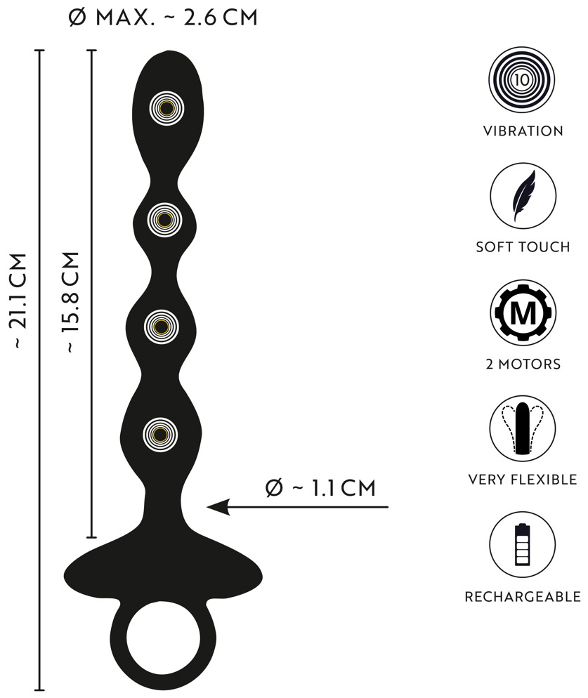 Anální kuličky se díky svému tvaru a silným a hlubokým vibracím postarají o intenzivní potěšení zadečku. Díky 2 motorkům vibrace ucítíte po celé délce kuliček.