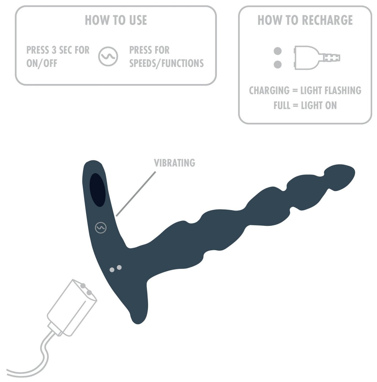 Jak se ovládájí? Podržením tlačítka po dobu 3 sekund zapnete/vypnete vibrace, krátkými stisky přepínáte mezi vibračními programy.
