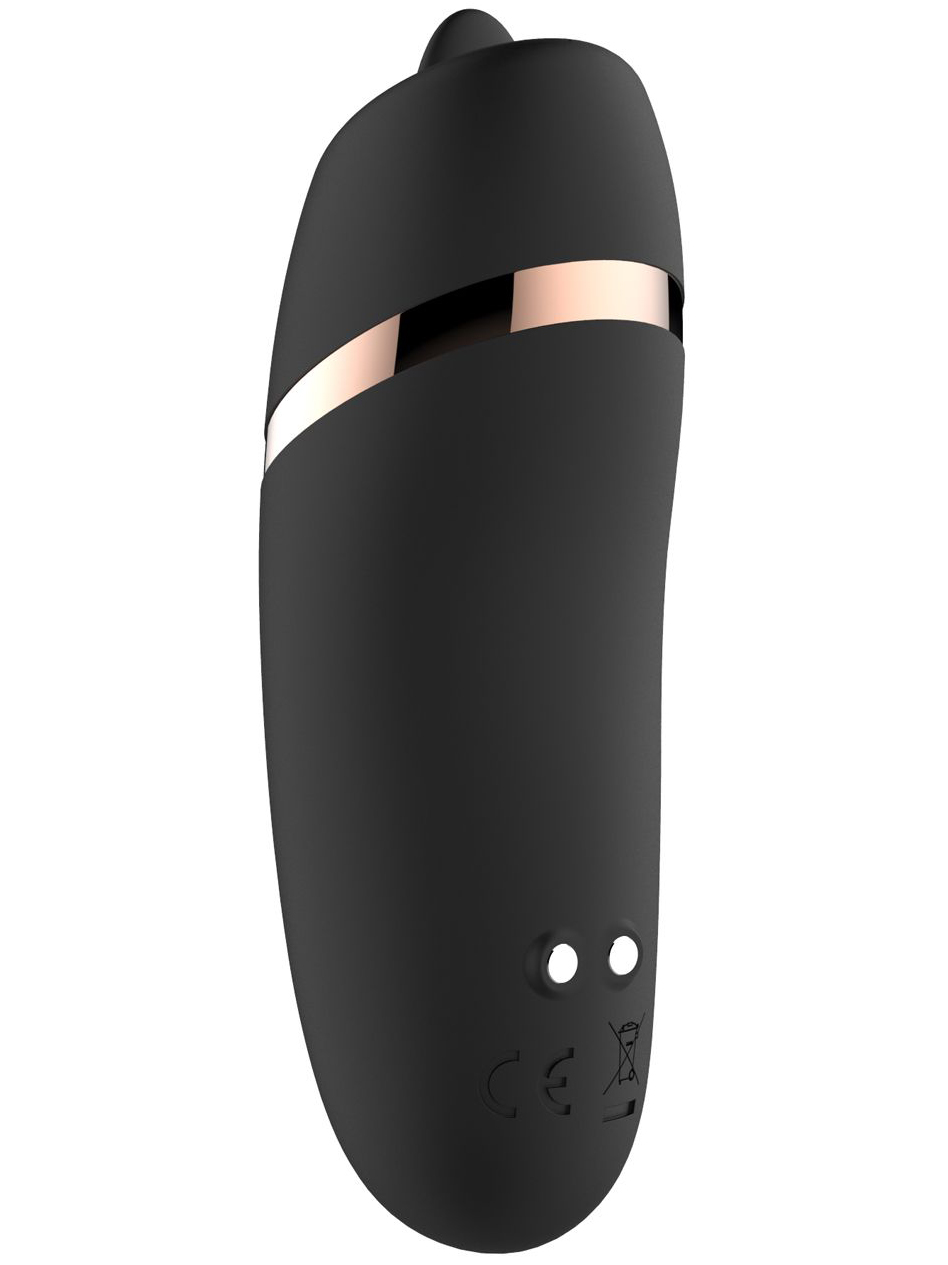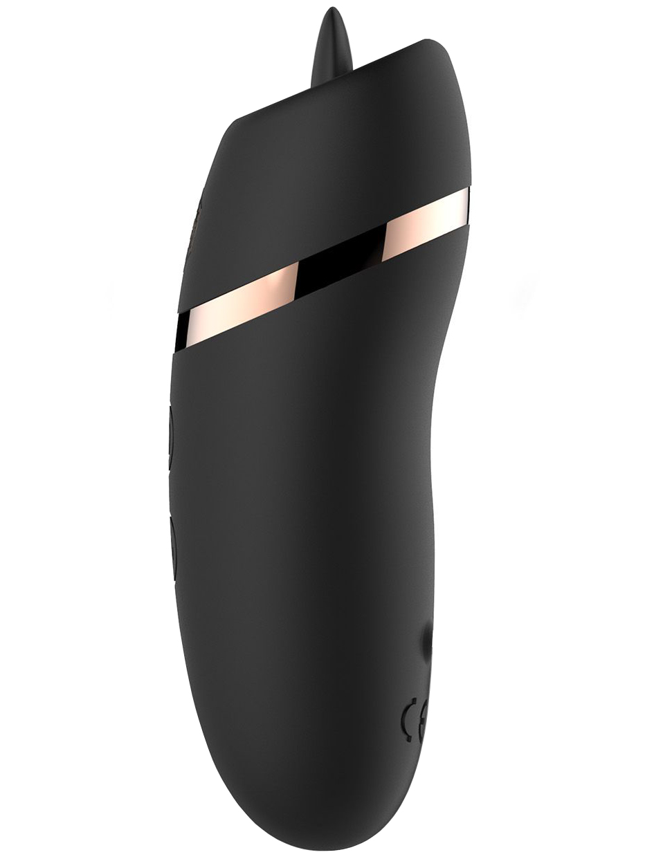 Stimulátor je oboustranný – jedna strana vás potěší silnými a hlubokými vibracemi, druhá pohyblivým jazýčkem, který imituje orální sex.