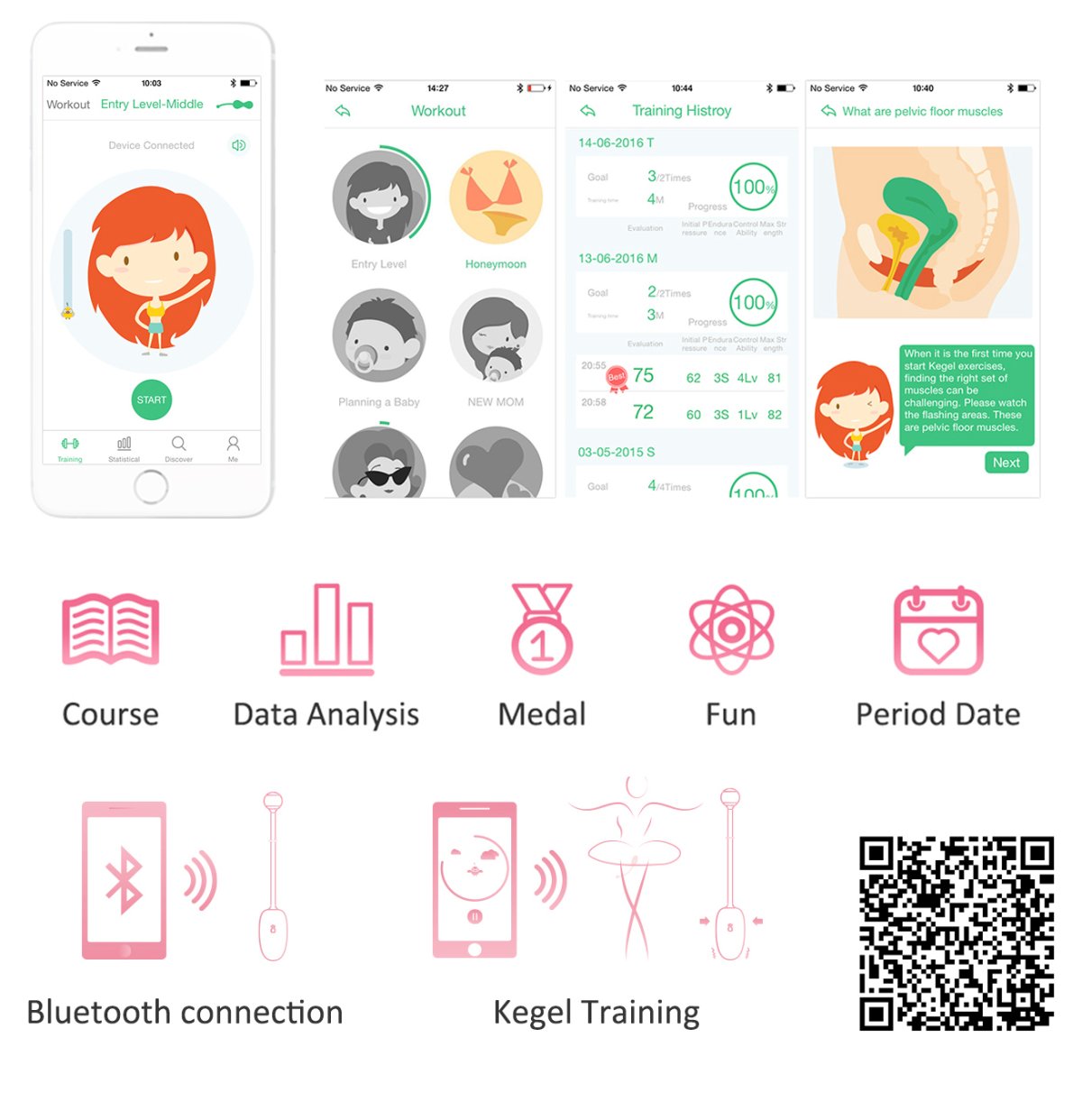 V aplikaci najdete kromě různých tréninkových programů (např. pro začátečníky, pro ženy, které plánují dítě nebo mají po porodu, pro obnovení síly pánevních svalů či program pro zúžení vaginy) také statistiky o vašem cvičení, menstruační kalendář a přednastavené vibrační programy, kterými se můžete odměnit po tréninku. Také si můžete nastavit intenzitu vibrací.