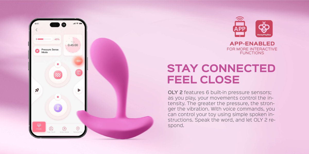 Vibrátor OLY 2 diskrétně provibruje bod G a klitoris, ať už se vydáte kamkoliv. Má snímač tlaku a teplotní senzor a můžete ho ovládat mobilem.
