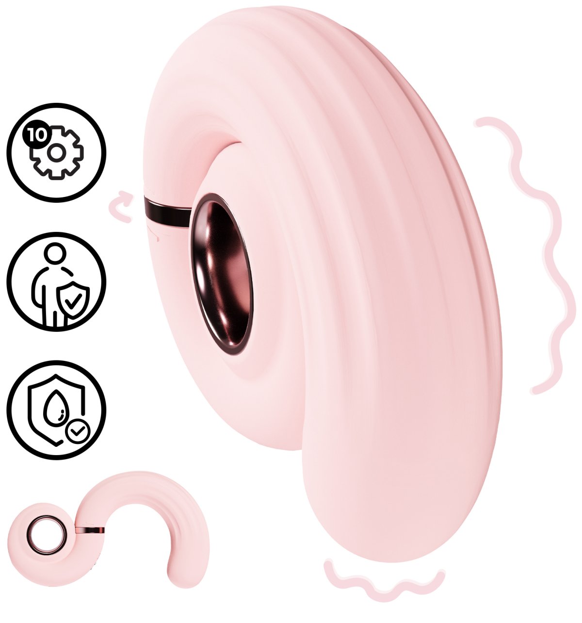 Rozšířená a výrazně zahnutá špička je tvarovaná pro přesnou stimulaci bodu G. Celkem se můžete těšit na 10 vibračních programů (3 intenzity + 7 vzorů), mezi kterými lze přepínat pomocí jediného tlačítka.