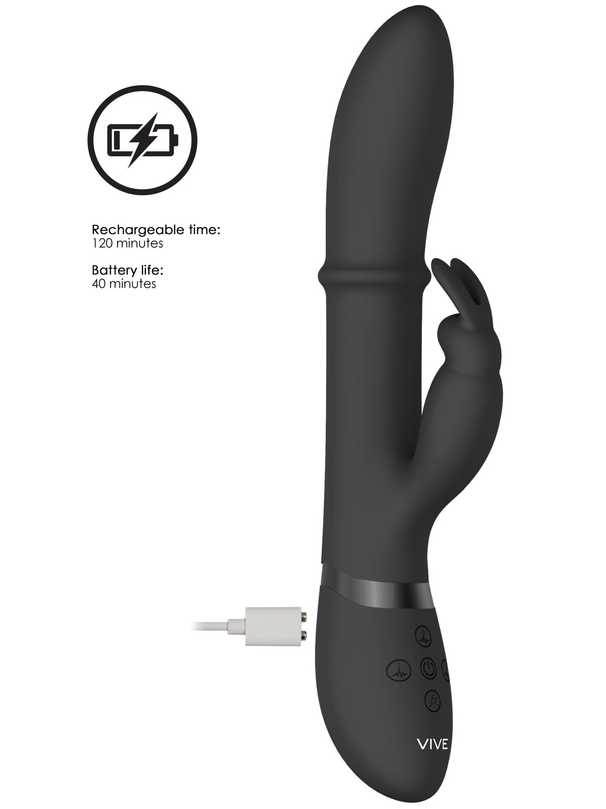 Vibrátor promasíruje bod G a poševní stěny vibracemi a 1 pohyblivým kroužkem. Vibrační králíček pak potěší i klitoris.