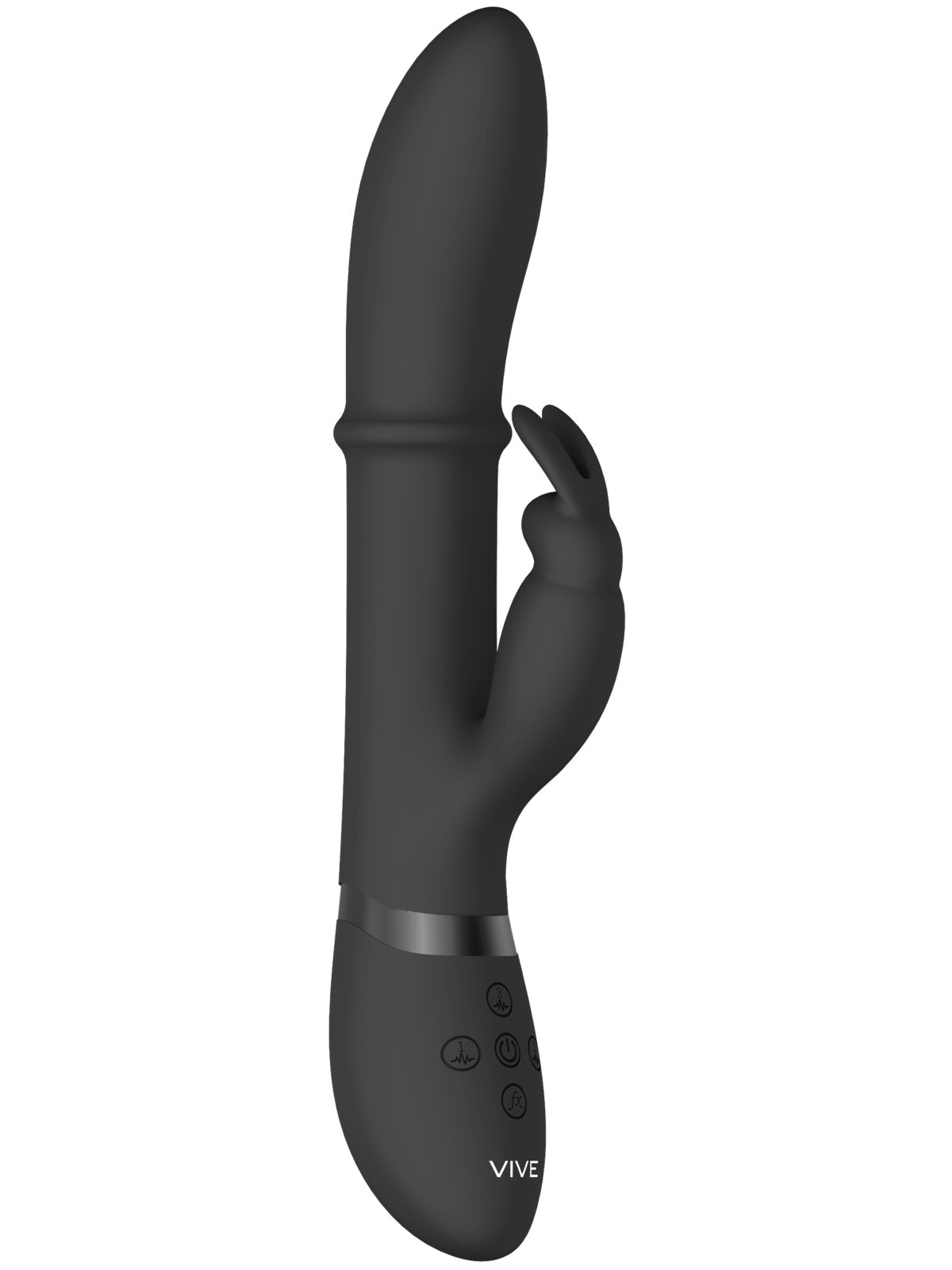 Vibrace v zasunutelné části a králíčku a stimulační kroužek ovládáte samostatnými tlačítky, takže si stimulaci přizpůsobíte momentální náladě a potřebám.
