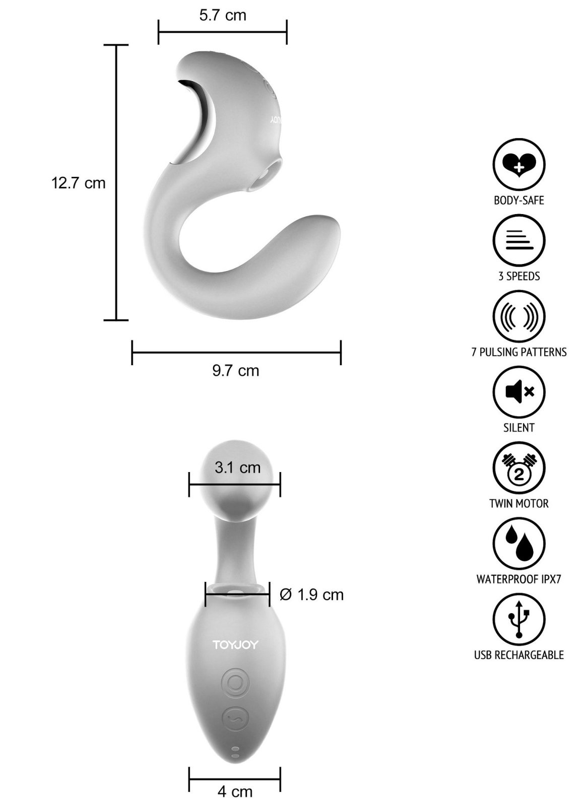 Má silné vibrace a motorky v zasunutelné části a výstupku na klitoris ovládáte samostatnými tlačítky – můžete si vybrat z 10 pulzačních módů a 10 vibračních programů.