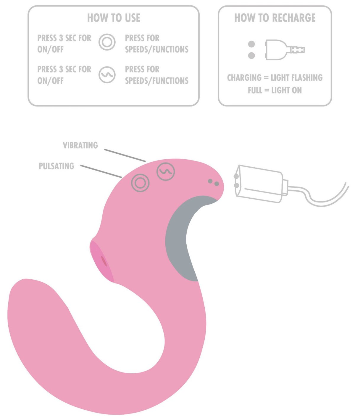 Jak se ovládá? Podržením tlačítka s vlnkou po dobu 3 sekund zapnete/vypnete vibrace, krátkými stisky přepínáte mezi vibračními programy. Podržením tlačítka s kolečkem po dobu 3 sekund zapnete/vypnete pulzace, krátkými stisky přepínáte mezi pulzačními programy.