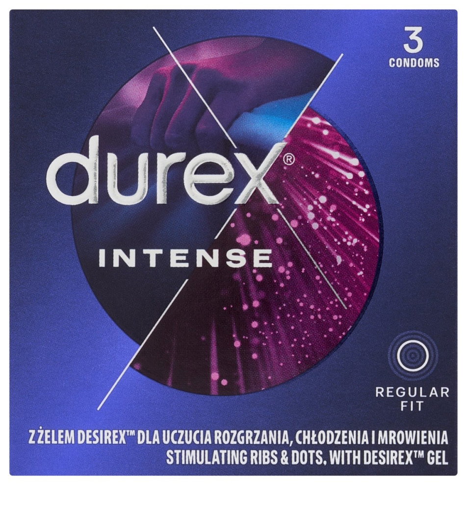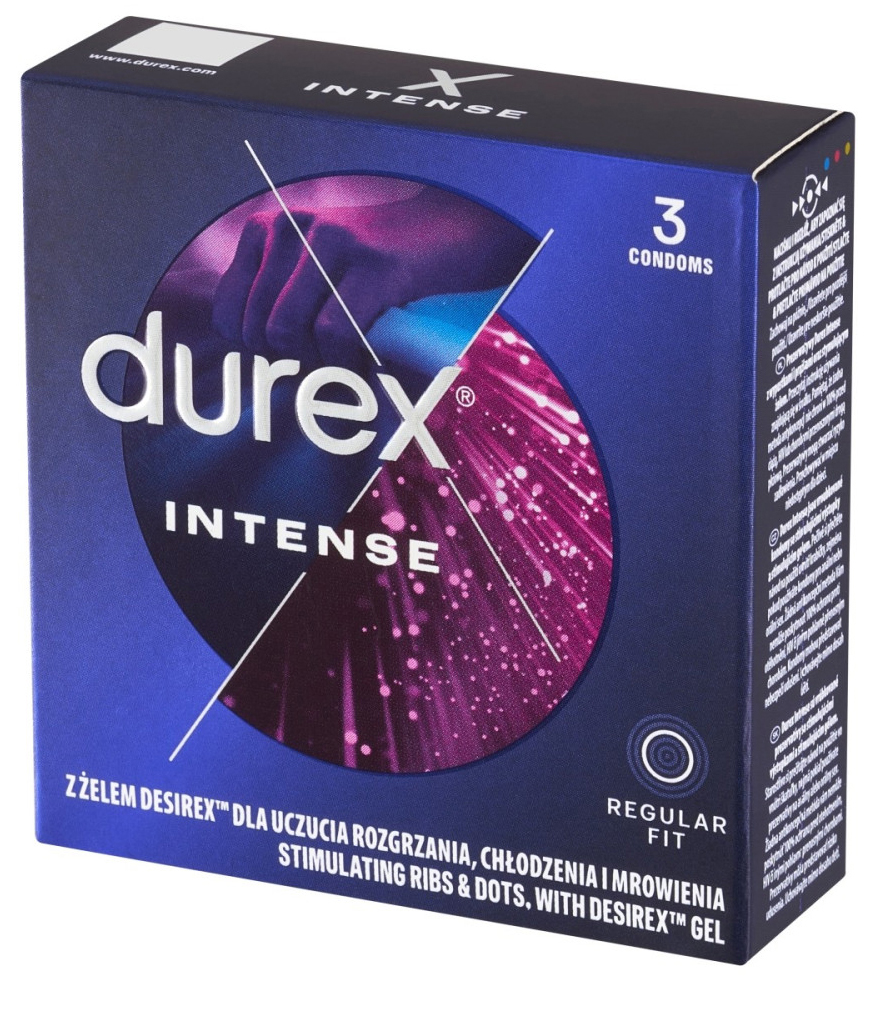 Kondomy DUREX Intense z přírodního latexu – se stimulační texturou a s gelem Desirex poskytujícím pocit zahřívání, ochlazení nebo mravenčení.