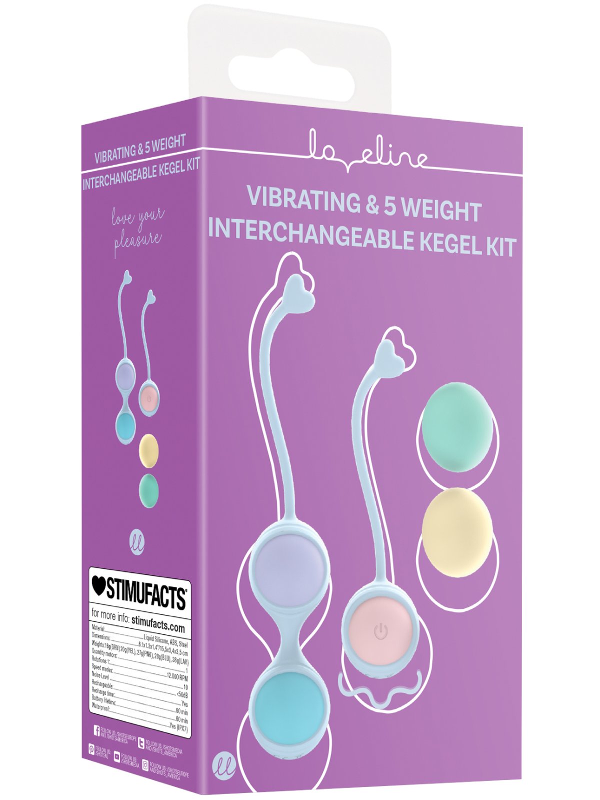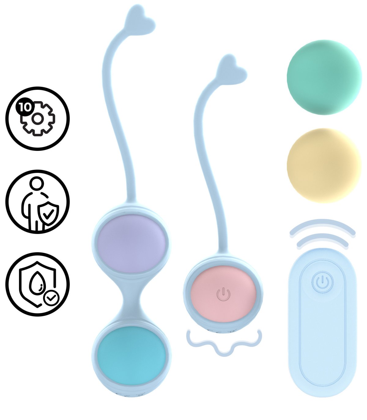 V balení najdete 2 silikonová pouzdra a 5 kuliček o různé hmotnosti. Jedna z kuliček je vibrační pro zpříjemnění posilování – lze ovládat dálkovým ovladačem.