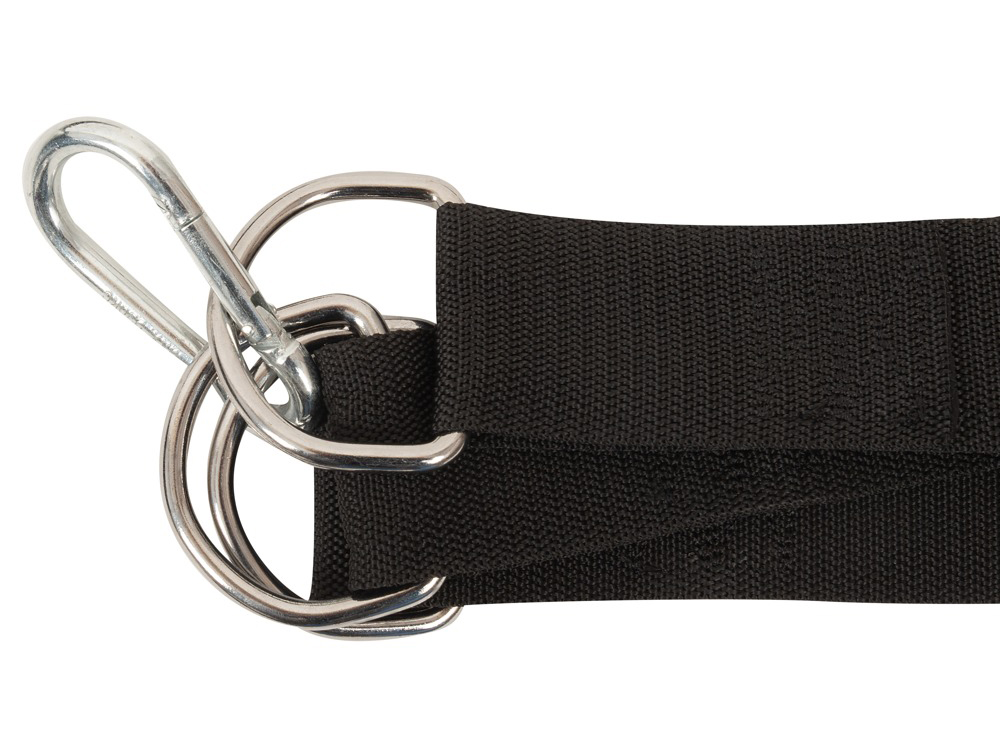 Kovový půlkruhový nosník visí na odolných textilních popruzích a lehací plocha je k nosníku připevněná pomocí řetězů. Výšku houpačky nastavíte podle potřeby pomocí karabin.