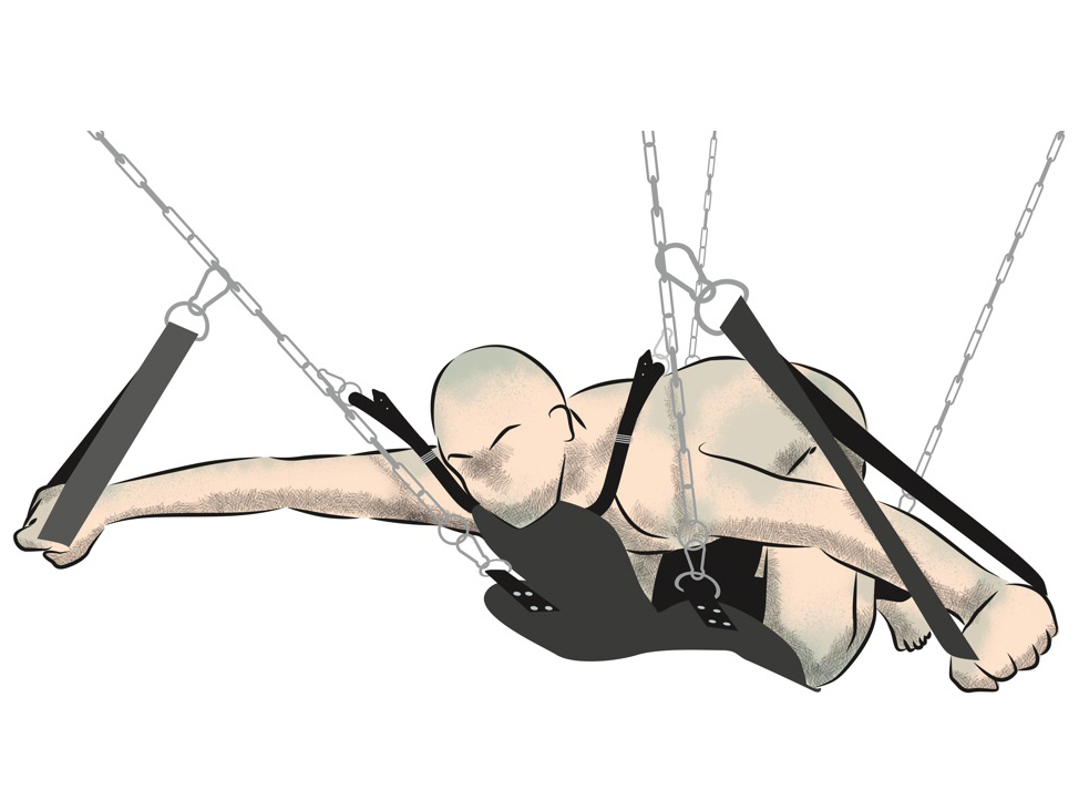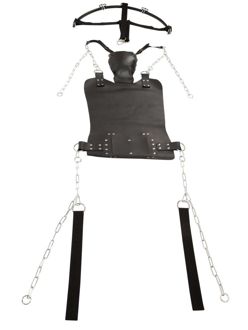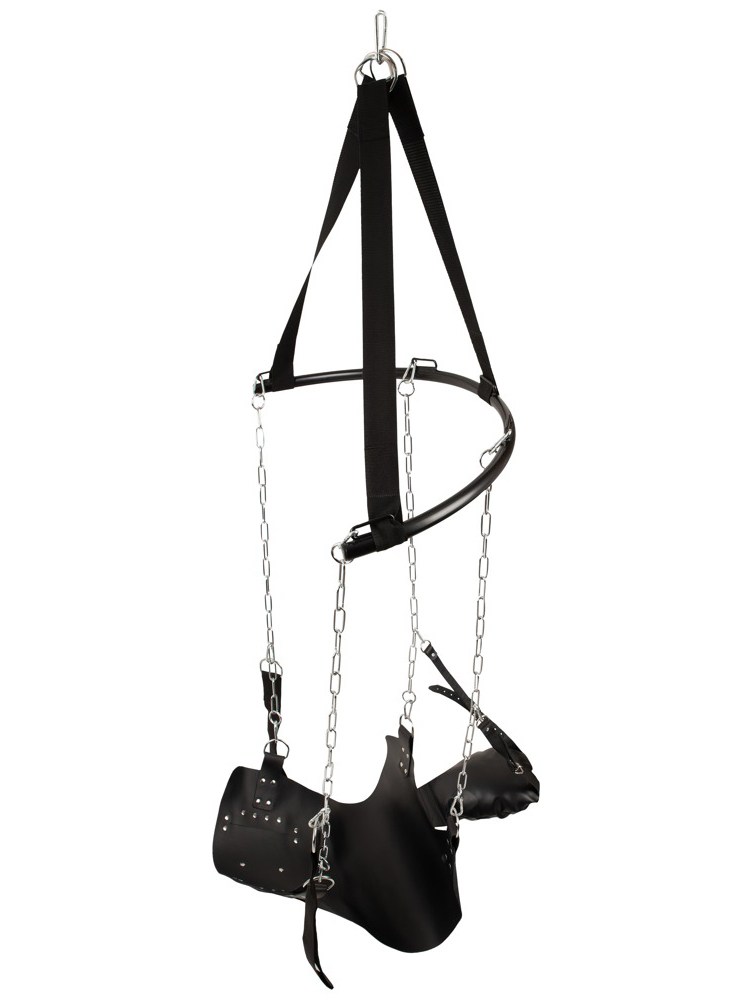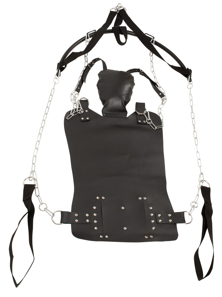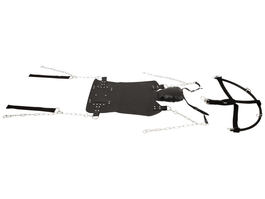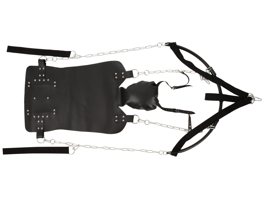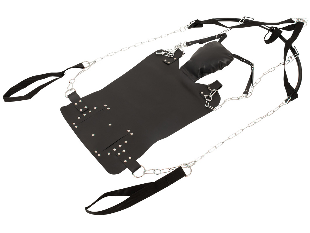 Lehací plocha (sedák) je vyrobená z tlusté kůže. Polštář je měkký a snadno nastavíte jeho úhel pro větší pohodlí. K řetězům navíc můžete pomocí karabinek připnout poutka na ruce a nohy pro jejich podepření.