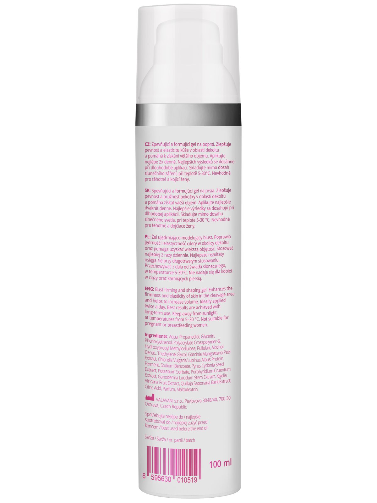 Gel obsahuje 4 komplexy účinných látek, u kterých studie prokázaly pozitivní vliv na zpevnění a vyhlazení kůže v oblasti dekoltu, zlepšení elasticity a zvětšení objemu poprsí.